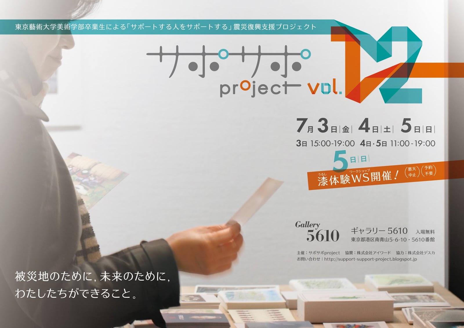 サポサポprojectは、2011年7月より開始した東京藝術大学美術学部卒業生による復興支援プロジェクトです。震災から4年が過ぎた現在も、被災地では多くの方々がまだ遠い復興の道半ばにおられます。そのような方々を今も現地での活動を通してサポートしているボランティア団体があります。私たちにできることは小さなことですが、東京でのアートとデザインの作品販売から生まれた支援金により、現地入りボランティア活動の後方支援を続けています。